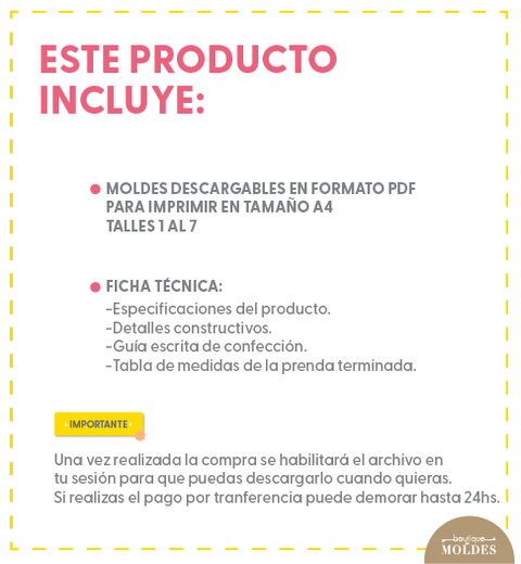Si elegis medio de pago por transferencia bancaria envia el comprobante a boutiquedemoldes@gmail.com puede demorar hasta 24hs en habilitarte el contenido.