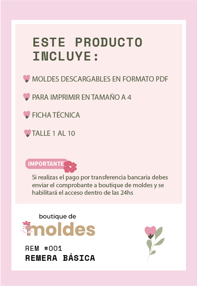 Si elegis medio de pago por transferencia bancaria envia el comprobante a boutiquedemoldes@gmail.com puede demorar hasta 24hs en habilitarte el contenido.